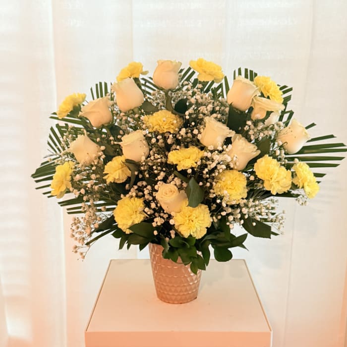 Price: $80.00"Blushing Garden” Rose & Carnation Bouquet