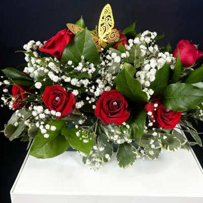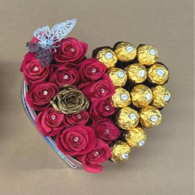 Price: $119.99 Sweetheart Delight – Heart-Shaped Bouquet with Fuchsia Pink Roses, Ferrero Rocher Chocolates & Metallic Silver Butterflies Product Tags: Same-day Delivery