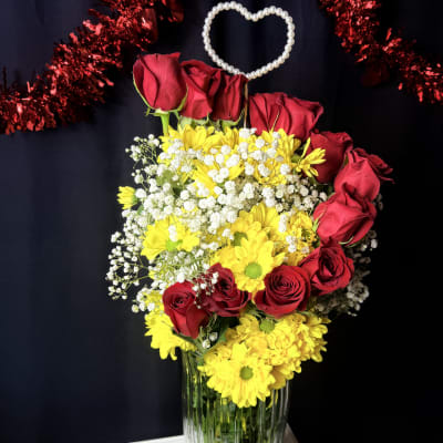 Price: $159.99 Sun-Kissed Romance– XL Cascading Red Roses, Yellow Daisies & Baby's Breath in Glass Vase Product Tags: Same-day Delivery