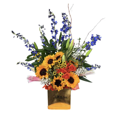 Price: $159.99 Sun-Kissed Romance– XL Cascading Red Roses, Yellow Daisies & Baby's Breath in Glass Vase Product Tags: Same-day Delivery